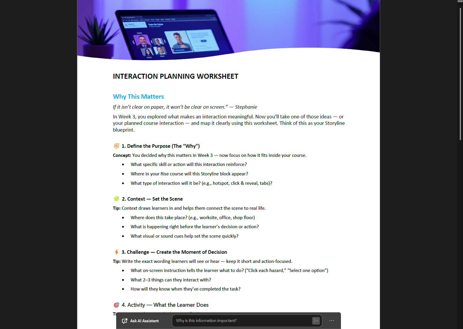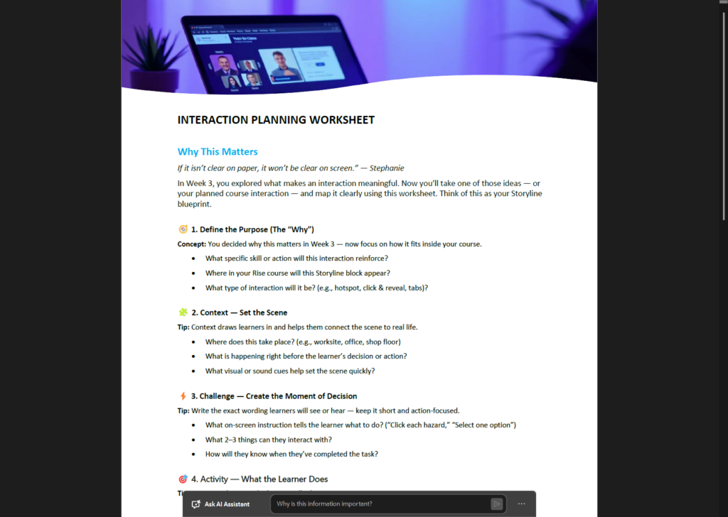 A self-paced Articulate program where AI is part of every step — not bolted on at the end. Built on the live training I've been delivering to corporate L&D teams since 2020, and redesigned from the ground up for on-demand delivery.